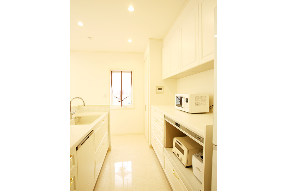 リビング階段と吹き抜けは、こだわりでした。それを形にしていただき、とても嬉しいです。大理石風の床も清潔感があり、掃除もしやすく気に入っています。2階には、夫婦の寝室のほかに、子ども部屋が3つ必要だったのですが、2階部分にうまく収めてくださいました。インテリアは、展示場のパープルとグレーのコーディネートが素敵だったので、そんな感じにしたいと大須賀さんに伝え、アドバイスしていただきました。シックでスタイリッシュにコーディネートしていただき、満足しています。特に、キッチンの扉とゴールドの取っ手は、三井ホームさんオリジナルのもので、一番のお気に入りです。
