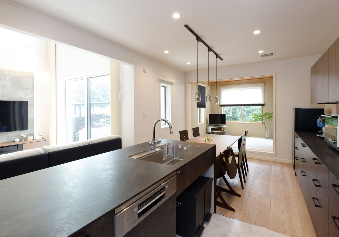 キッチンは事前の情報収集の際にデザインや性能をみて「キッチンハウス」のキッチンにすると決めていました。キッチンから子供たちの様子やテレビを見られるようにしたくてアイランド型にしようかなと。リビングの窓から中庭も見えるので子どもたちが外で遊んでいるときも安心して作業できるのも嬉しいですね。あと回遊動線にもなっているのも実際に生活してみてよかったなと感じた部分です。