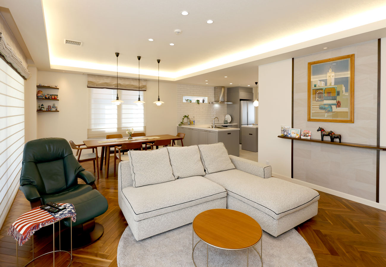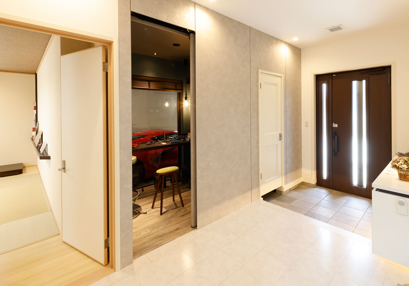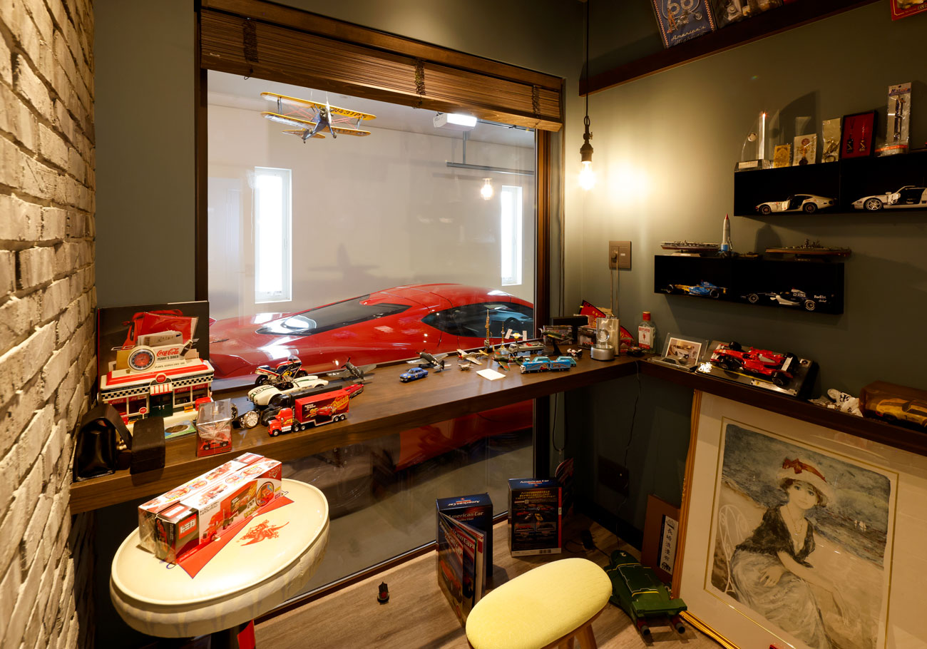 ガレージは愛車が映えるような壁色やライトを選んでもらい、要望通りに仕上げてもらいました。バッテリーが上がらないように充電用のコンセントを設置してくれたりと細かい気遣いもあってとても助かりました。さらに愛車が見える部屋をつくってもらい、ロマンを叶えてくれました。孫たちからわからないようにしたいとお話したら、隠し扉の仕掛けを作ってくれて、まさに男の憧れをかたちにしてくましたね。