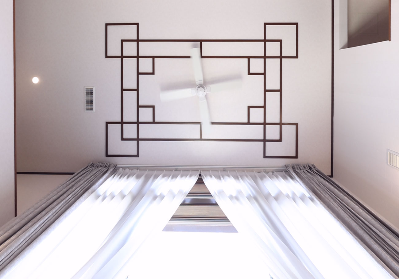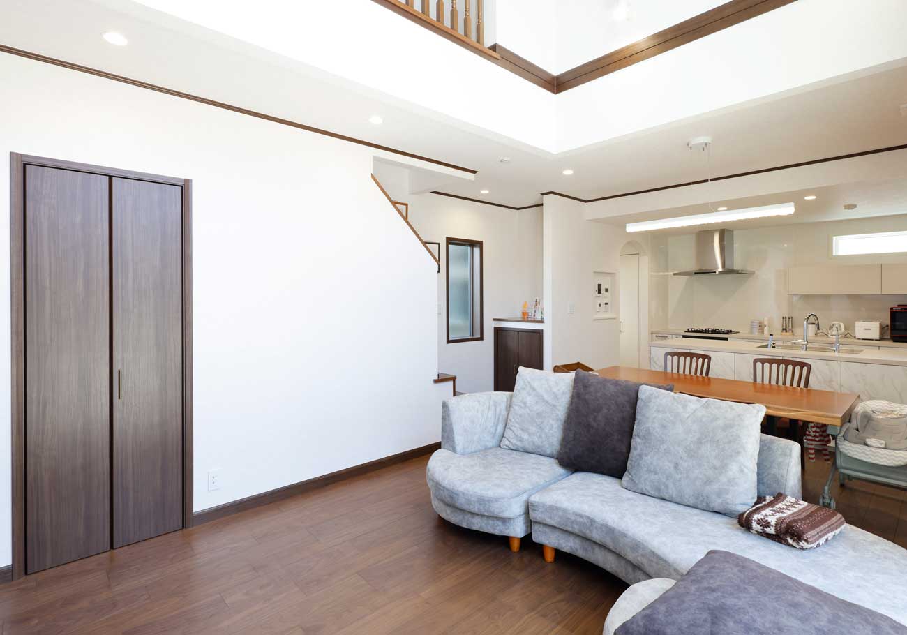 こだわりたかったリビングの天井飾りを、設計の清水さんから本当にたくさんの模様をご提案いただき、イメージをかたちにしてもらいました。この部分にこだわることでこの家が理想通りになったと感じています。出来あがって初めて、この窓と吹き抜けを見たときは「本当に建ててよかったな」と率直に思いました。