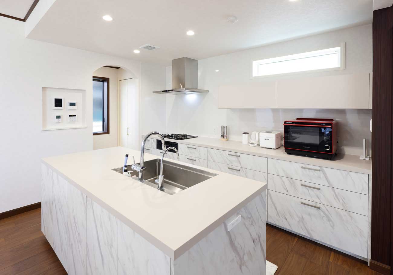 子供がいるので中庭があった方が家の中から子供を見ていられるし、この大きな窓越しに外と中が繋がっている感じがすごく好きで一目惚れでした。キッチンにいても繋がりを感じるようにしたかったので、料理中も中庭を通して玄関が見える希望もかたちにしていただきました。