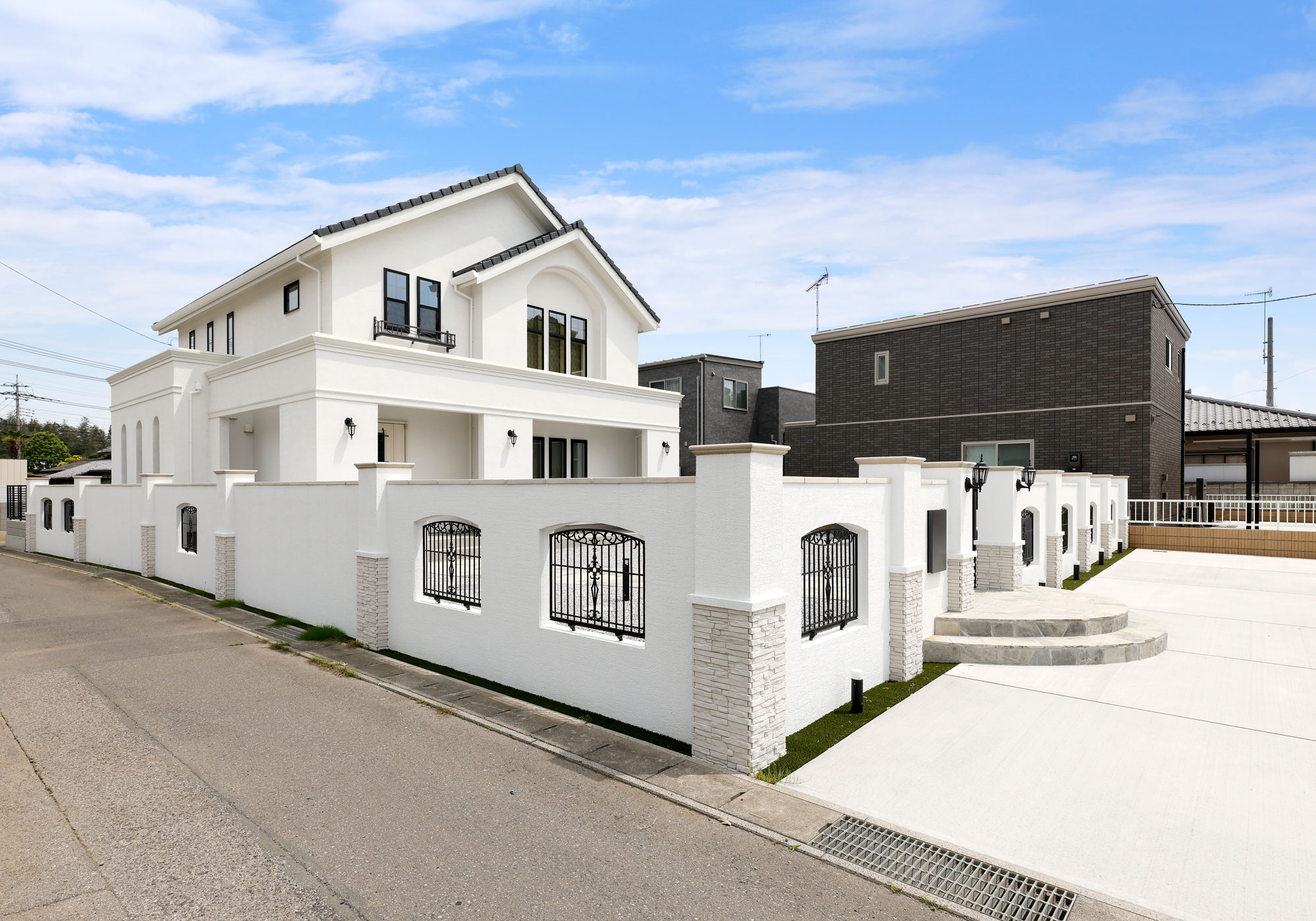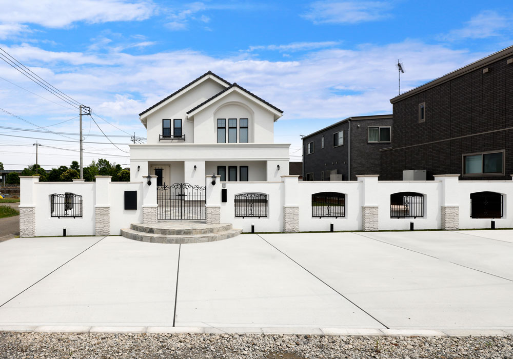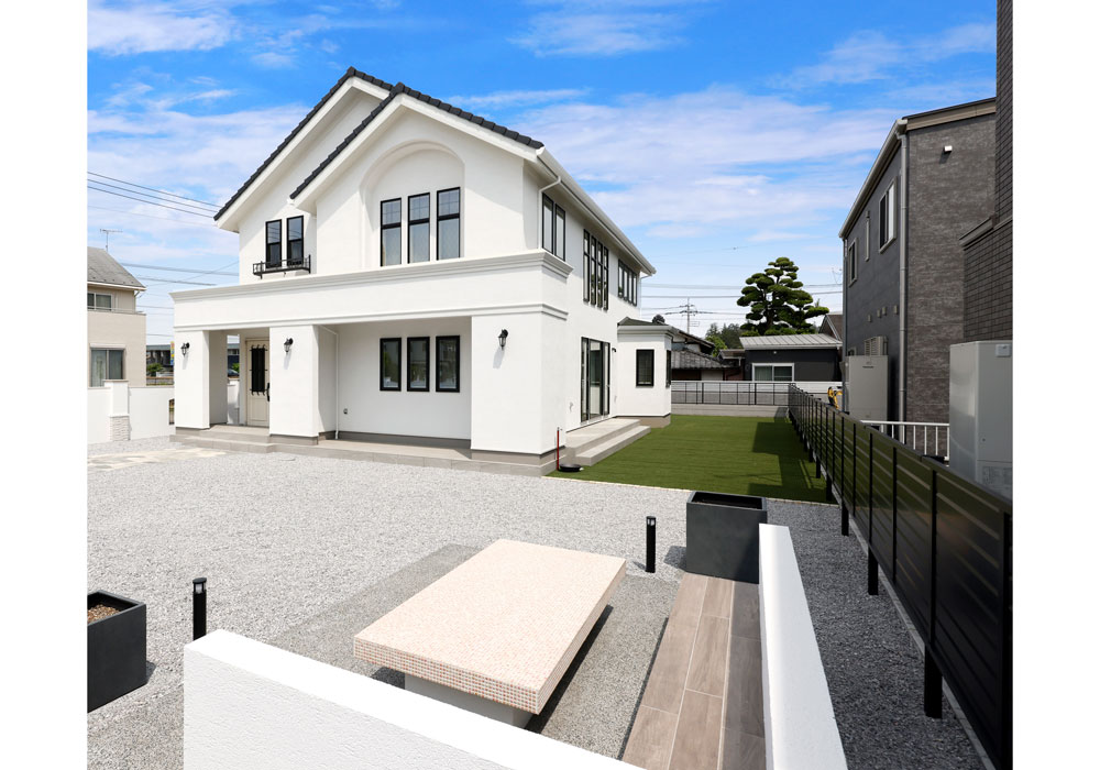 白地に映える漆黒のサッシや軒に刻まれた細かな溝、アンティーク調の玄関ライトなどエレガントでありながらスタイリッシュなデザインは私たちの理想どおりの外観となりましたね。