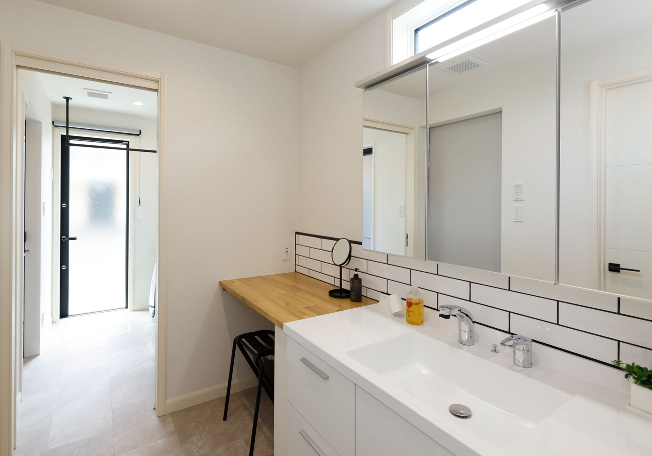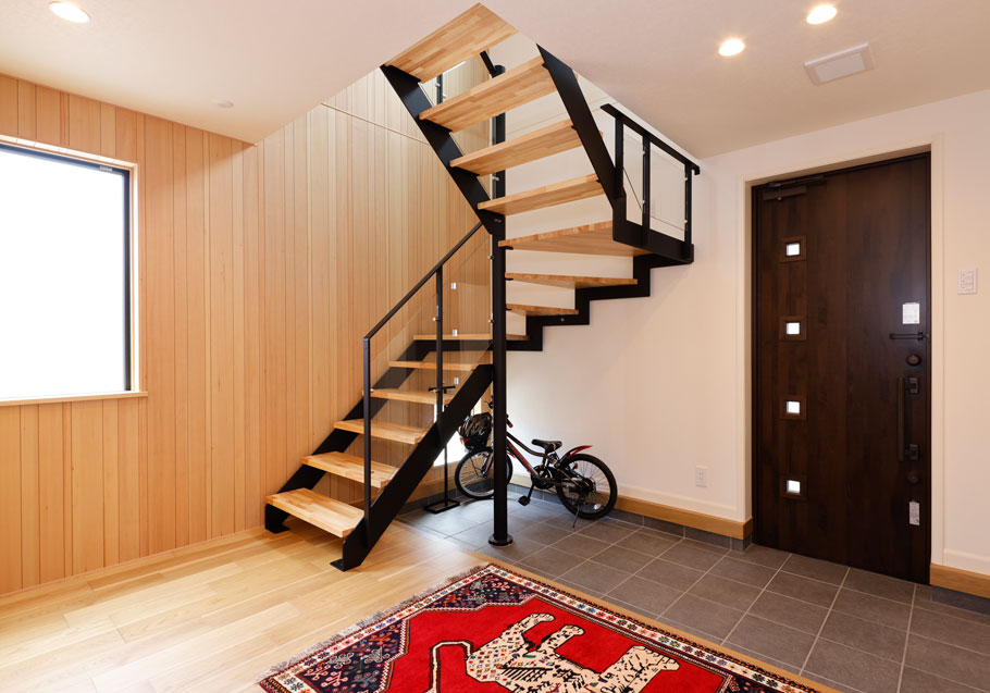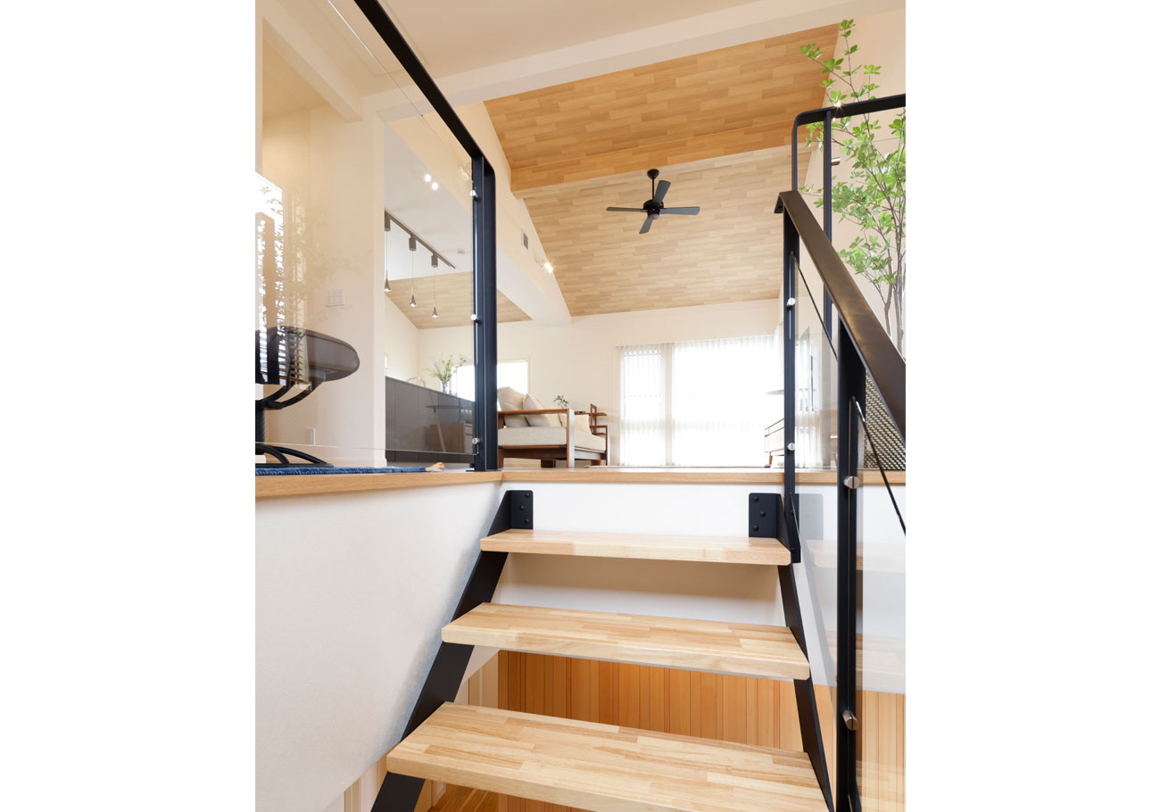 高崎双葉の街なかモデルを見て、スケルトンの階段に一目惚れしました。夫と「これにしたいね」と話し、そのまま再現してもらいました。アイアンの手すりや木の階段、壁の素材まで忠実に。洗面台横の棚や、玄関を入ってすぐの階段の動線まで、街なかモデルのデザインをそのまま取り入れてもらい、大満足です。