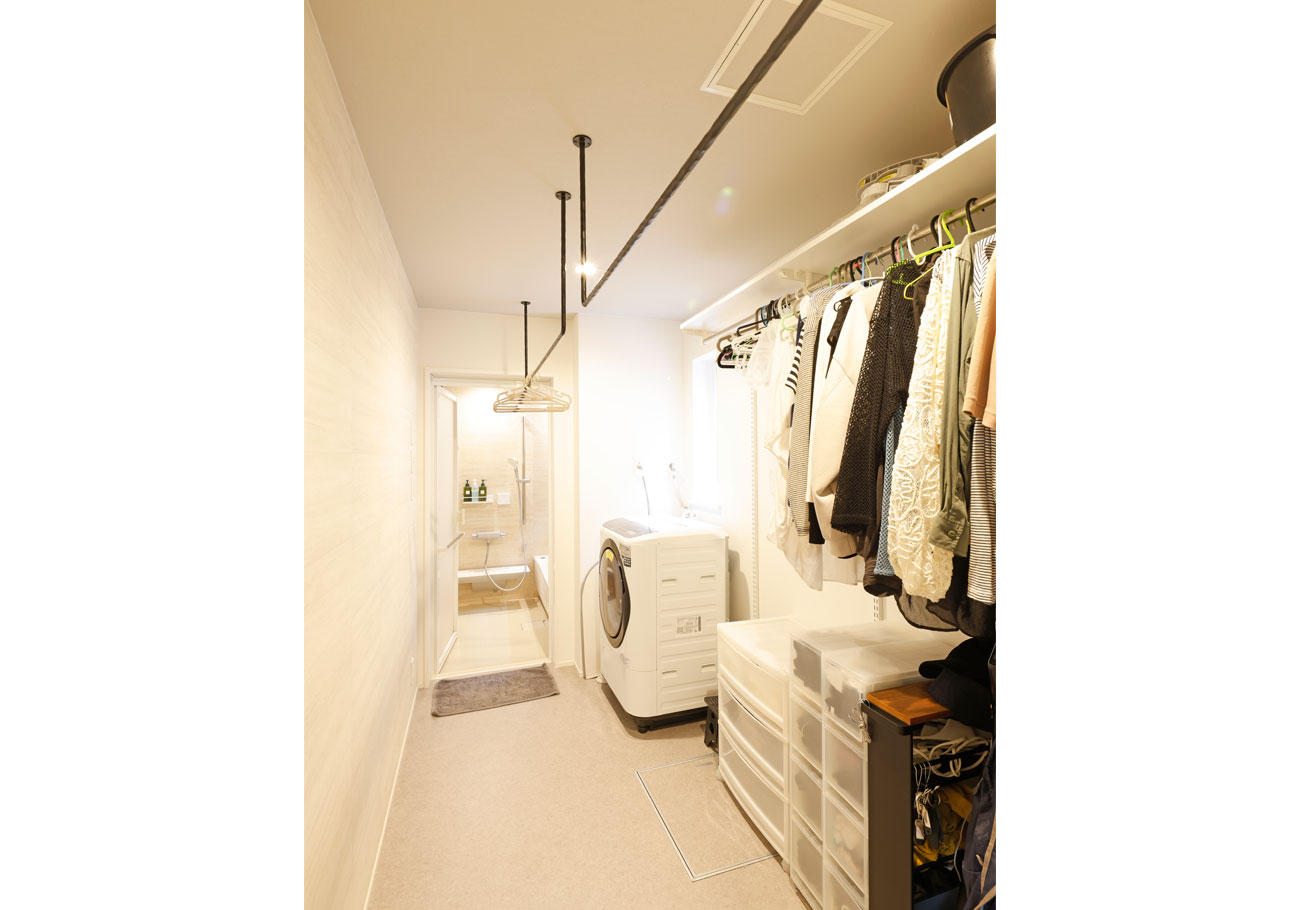 生活動線にも多くの工夫を凝らしました。特に、脱衣所とランドリースペースの一体化は大成功でした。一般的にはランドリールームを別で設けることが多いかもしれませんが、私たちは広さと合理性を重視して、仕切りを取り払いました。全館空調のおかげでクローゼットに湿気がこもる心配もなく、服を安心して収納できるのも魅力です。動線を考慮した設計が、毎日の生活をより快適にしてくれています。