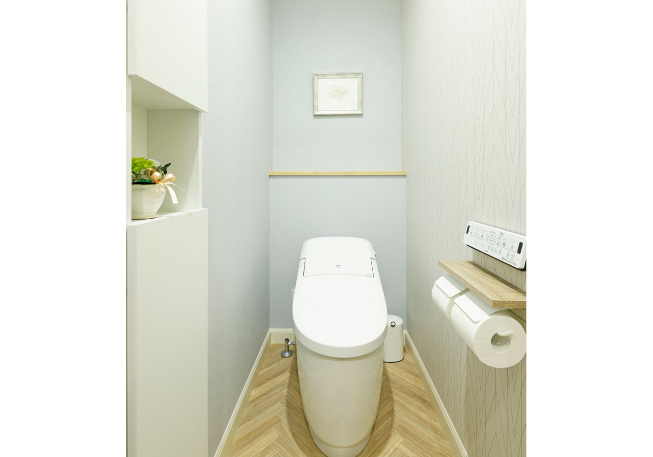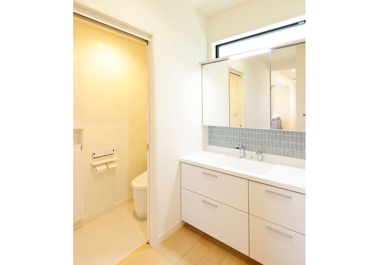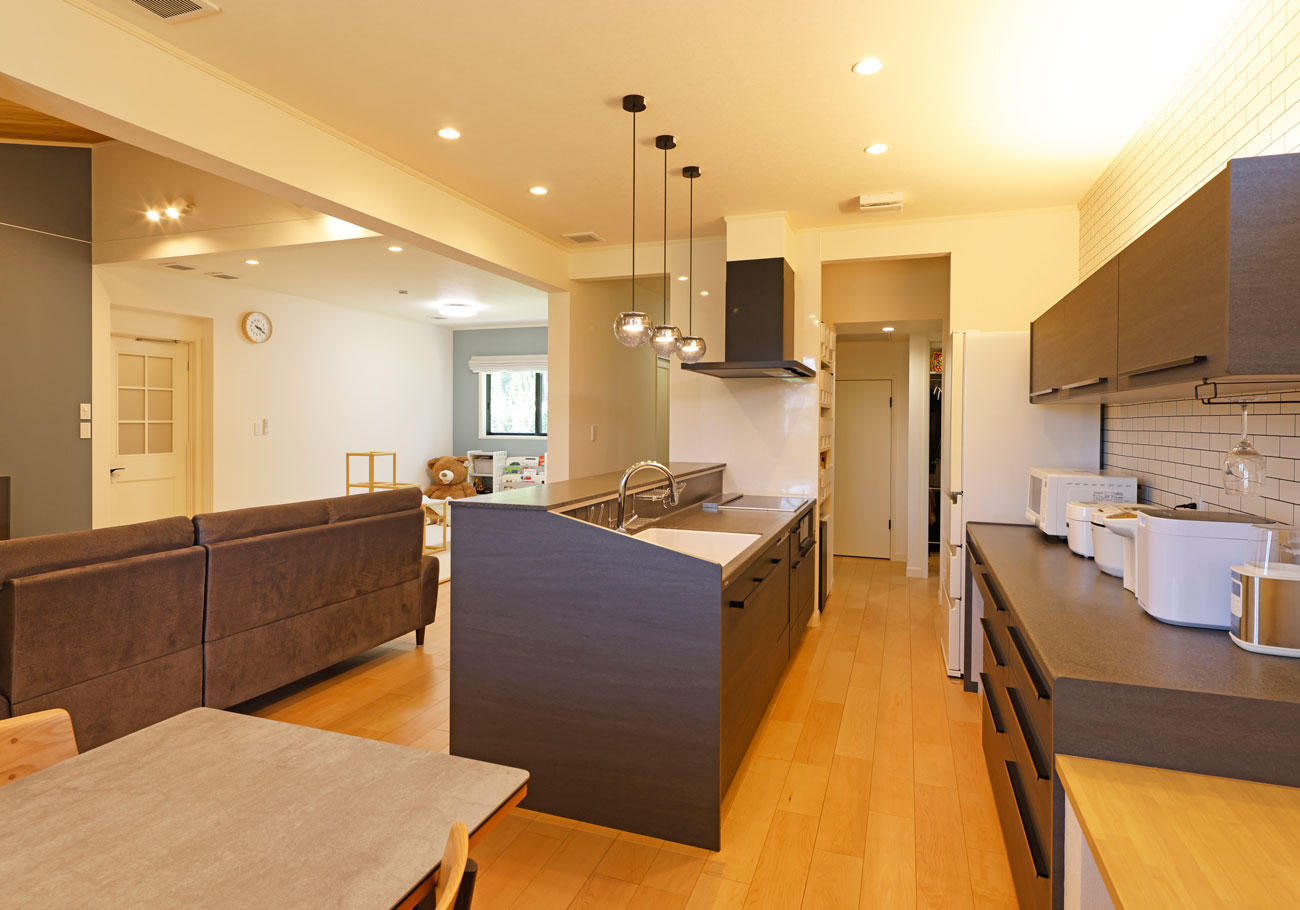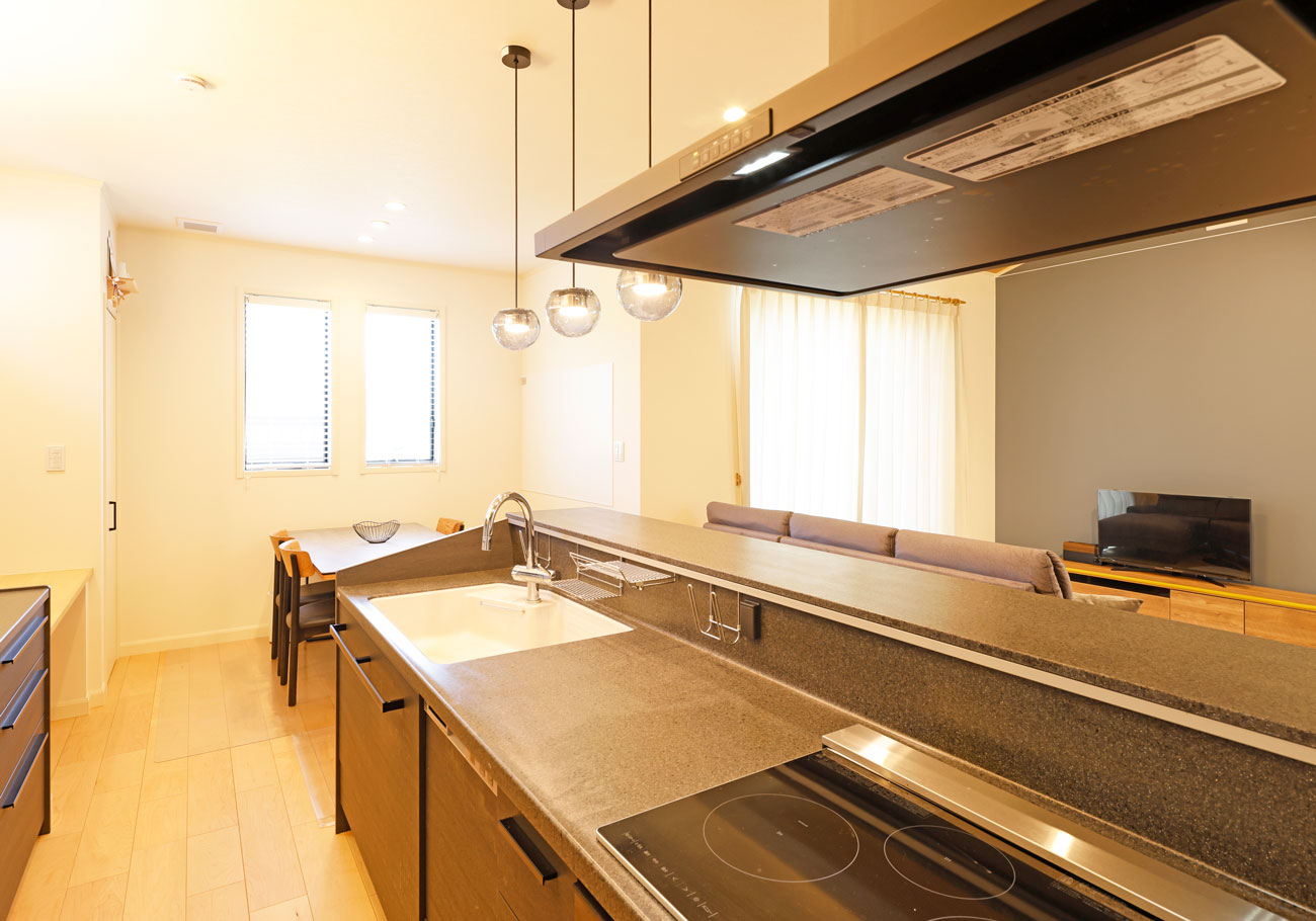 私たちの家では、動線の使いやすさに特にこだわりました。キッチンからリビングやお風呂場への移動がスムーズで、家事や育児が効率よくこなせるようになっています。また、リビングの大きな窓からは外で遊ぶ子どもの様子が見え、安心して家事を進めることができる設計です。インテリアにも細かなこだわりが詰まっています。特にお気に入りはキッチンのペンダントライトやタイル風のクロスで、全体を白と黒とグレーで統一し、落ち着いた雰囲気を演出しました。コーディネーターの滝川さんが提案してくれたデザインはどれも私たちの好みにドンピシャで、打ち合わせのたびに新しい発見がありました。毎回の打ち合わせが楽しく、理想の家づくりを楽しめました。
