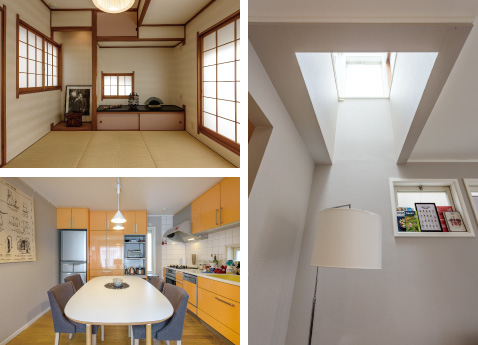 K様が特に気に入られたという3階の和室(左上)と、2階のキッチン(左下)。