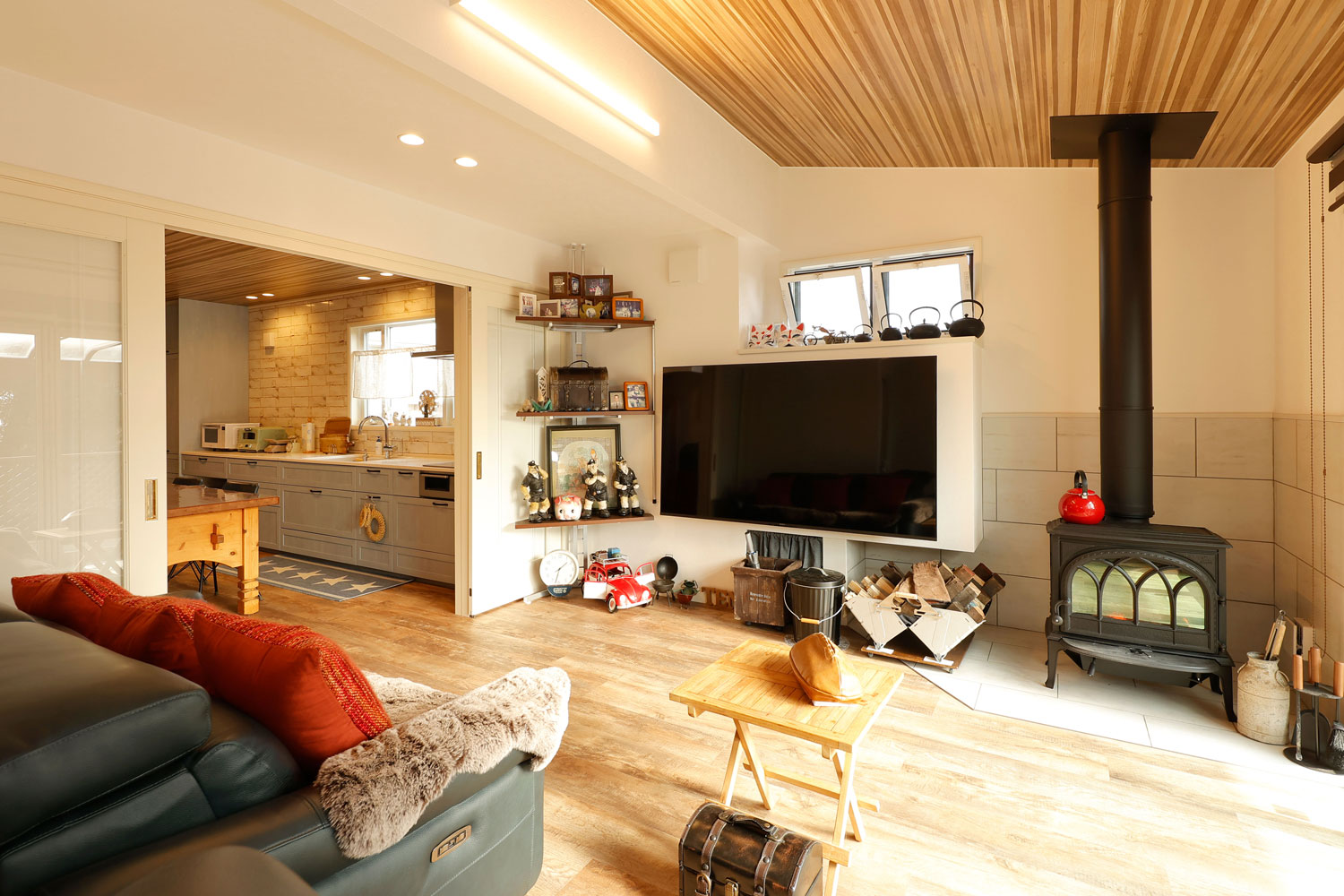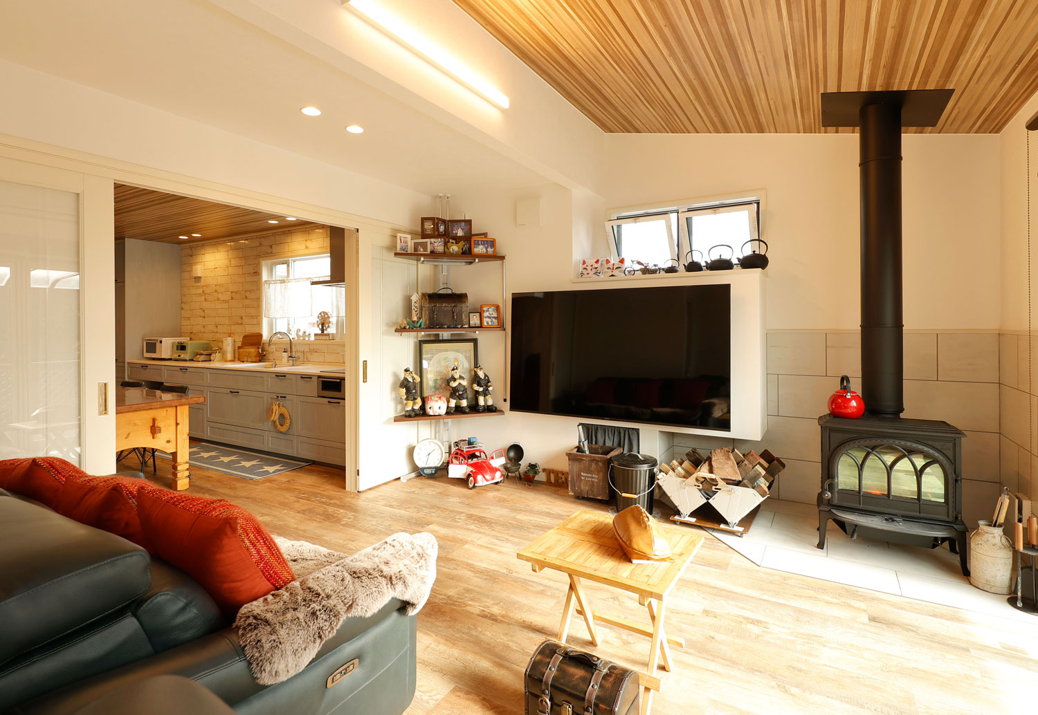 最初は土間を増築して、そこに薪ストーブだけ置こうかと考えていました。ただ「薪ストーブのある空間で何をしたいのか」と問われて、「家族と一緒に酒を飲んだり、落ち着いて話ができる空間」にしたいと考え直しまして、新しいリビングとして増築しました。 薪ストーブのデザインやサイズなどはすべておまかせでカーテンも機能的且つおしゃれなものにしていただいて、とても落ち着く部屋になったと思っています。 薪ストーブがあれば正直、冬はエアコンをほとんど使わないですね。2階まですぐにあったかくなりますよ。ちなみに薪は自分で裏山から調達して使っています。早く自分で用意した薪の火を見ながら息子たちと一緒にお酒を飲みたいですね。
