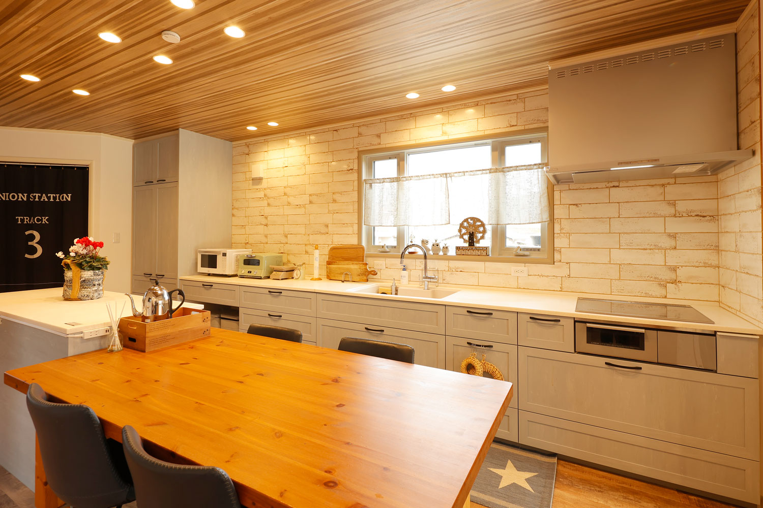 今回のリフォームのきっかけとなった薪ストーブの暖かさはもちろん、オフシーズンでもインテリアとしてなじむような配置とし、そこからシステムキッチンまでがとてもシンプルな形になりました。システムキッチンも5.0mを超えた長さになり広々したスペースになりました。お子様が帰られた時など、ゆったりと皆様でキッチンに集える空間となりました。