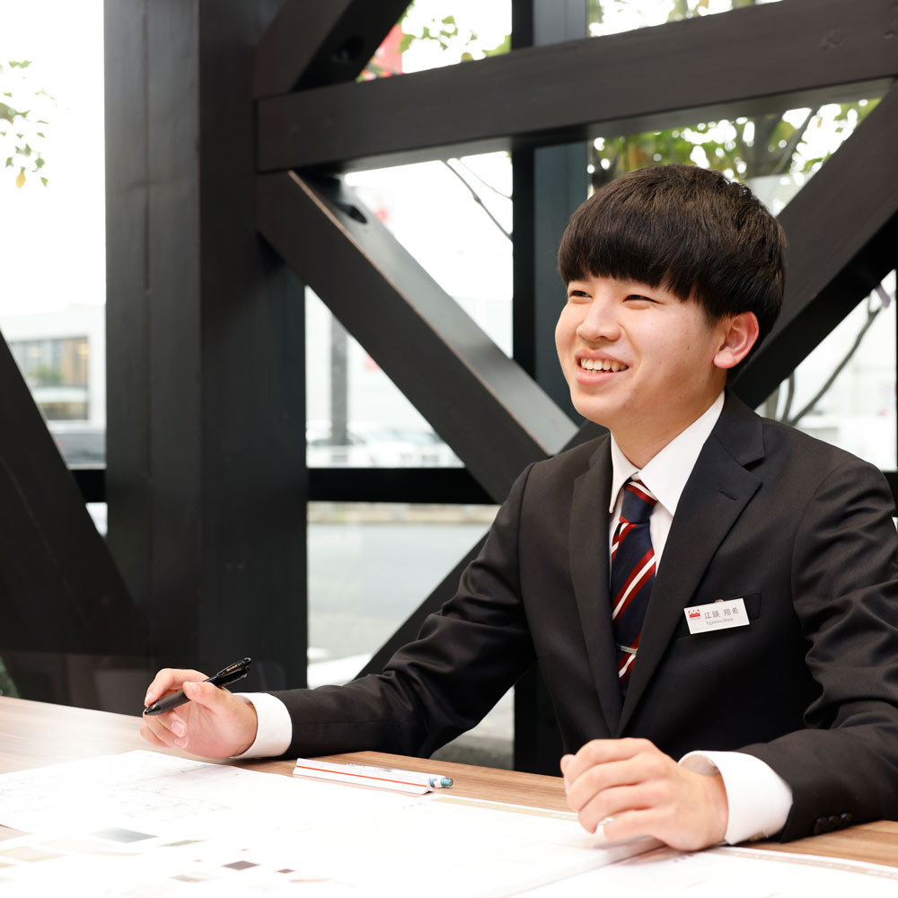2023年に入社した江頭と申します。初めてお会いした方にはよく「えがちゃん」と呼ばれます。昔から絵をかいたり物作りが好きで、それらをふんだんに活かせる建築に携わっていきたいと思い、専門学校にて建築を学び群馬ホームに入社致しました。